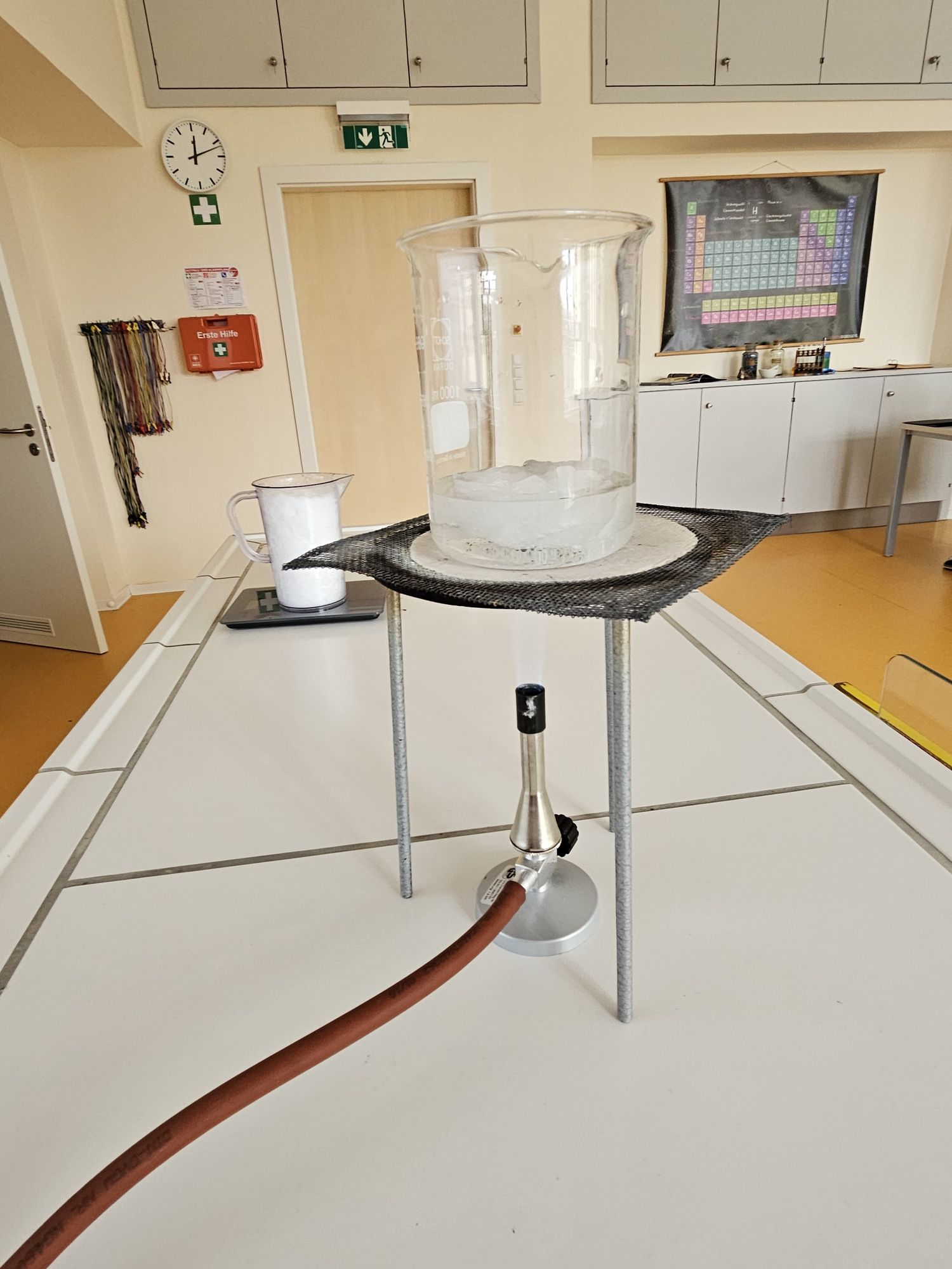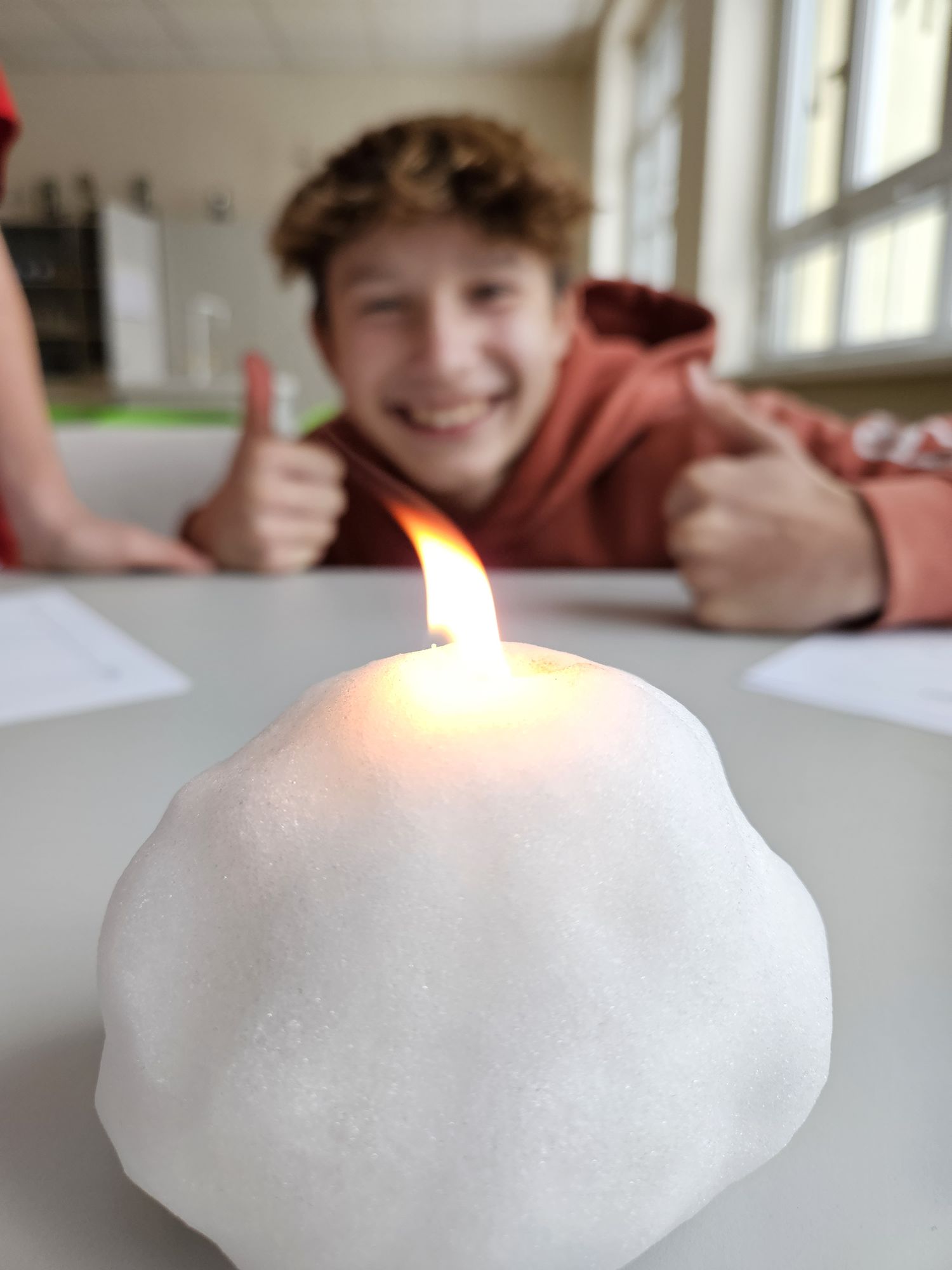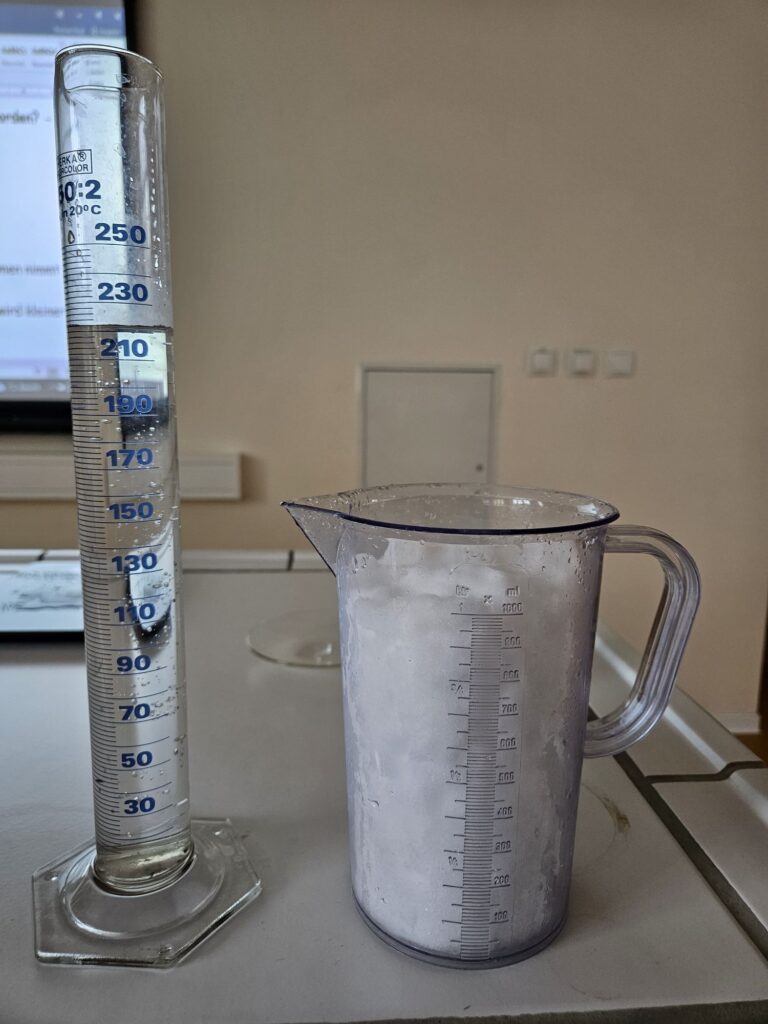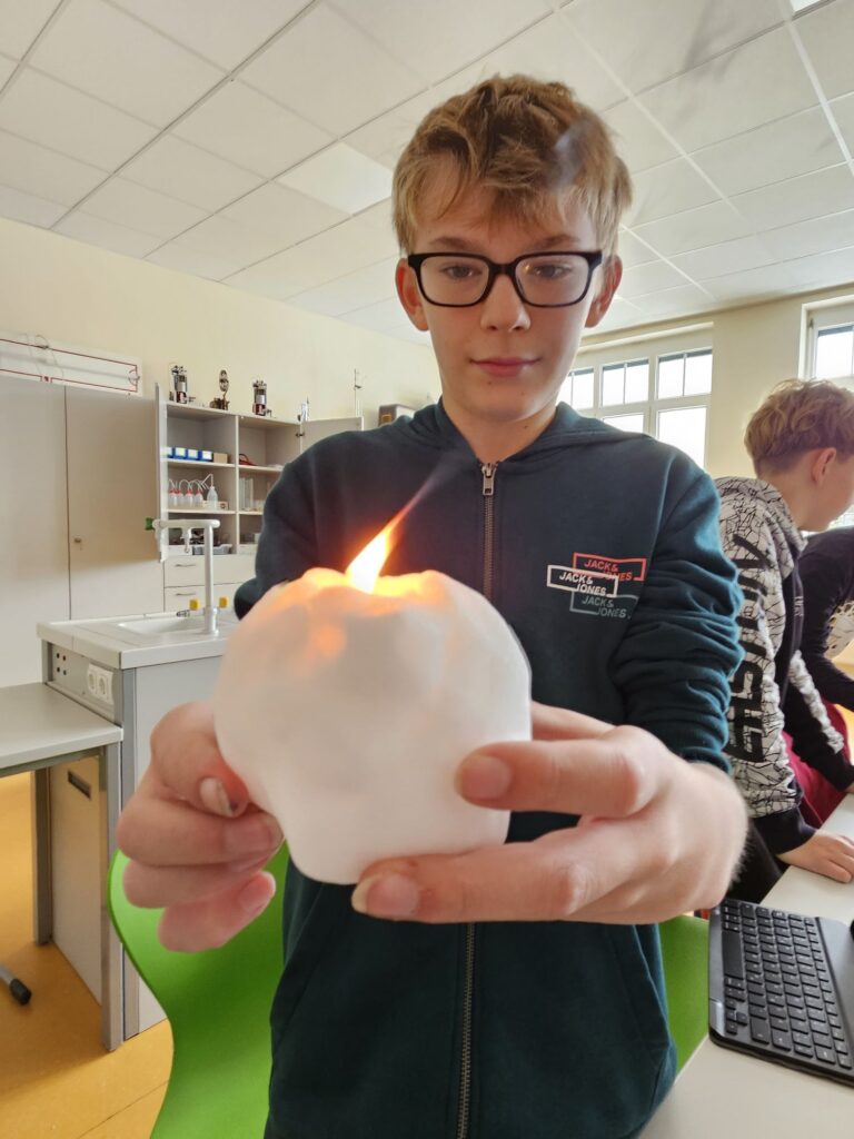 Im Rahmen der Experimente widmeten wir uns in forschender Weise Fragestellungen wie z.B. „Wie viel Liter Wasser erhält man beim Schmelzen von 1 Liter Schnee?“ oder „Kann ein Schneeball brennen?“.