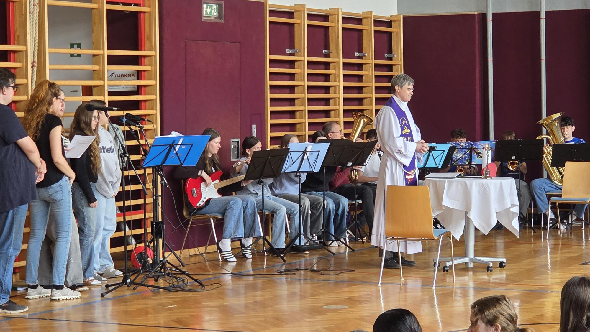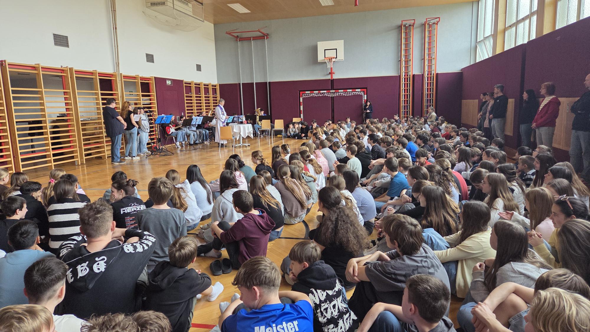 Ein gemeinsamer Wortgottesdienst wurde im Turnsaal gefeiert. Musikalisch begleitet wurde dieser von der Schulband, die mit ihren Beiträgen für eine festliche Atmosphäre sorgte und die Schulgemeinschaft zusammenbrachte.