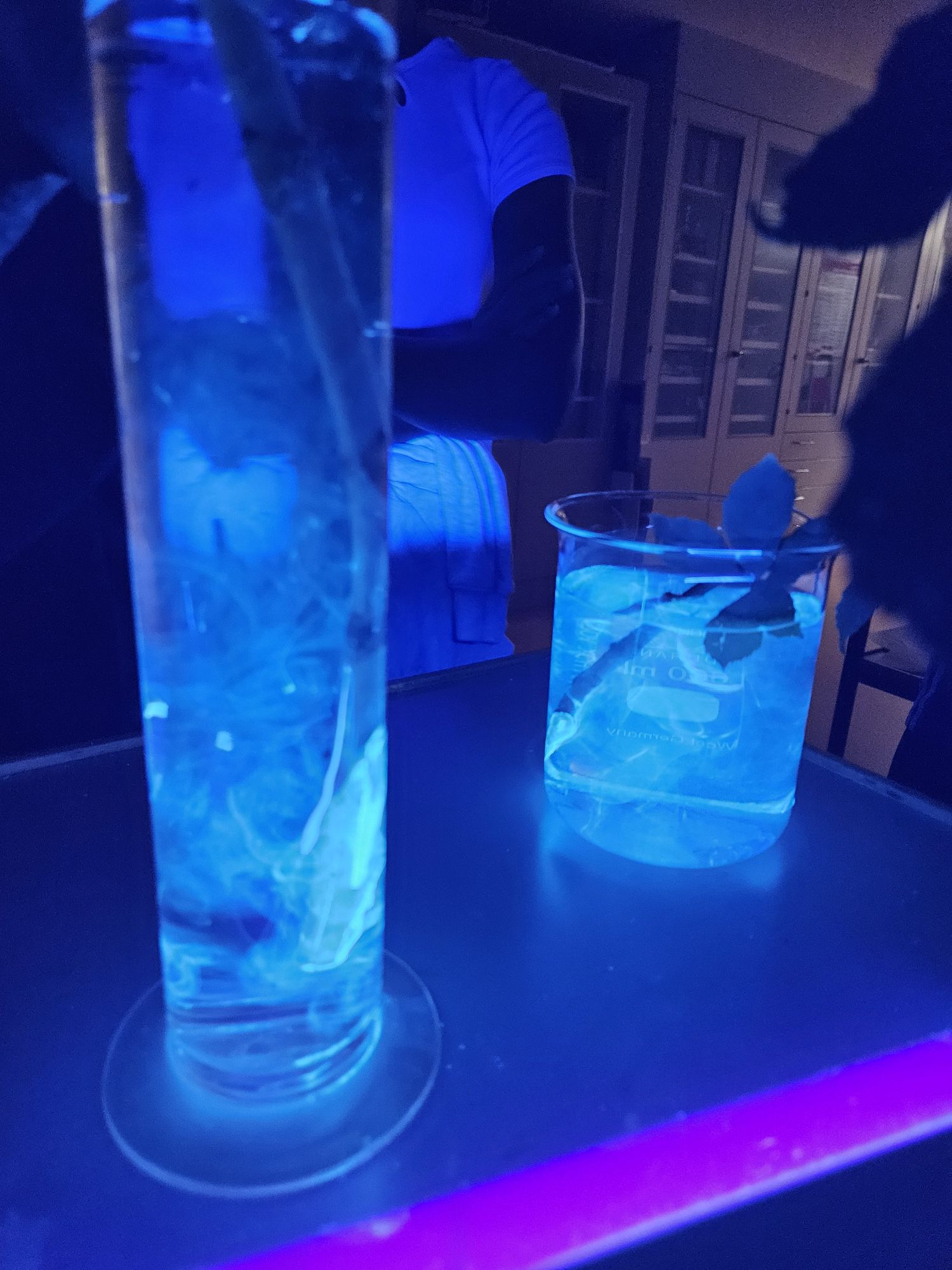 Ein frisch angeschnittener Rosskastanienzweig bildet in Wasser blau fluoreszierende Schlieren. Das im Zweig enthaltene Aesculin beginnt bei der Bestrahlung mit UV-Licht selbst zu leuchten. Aesculin wurde bereits 1929 als Aufheller für Wäsche verwendet.